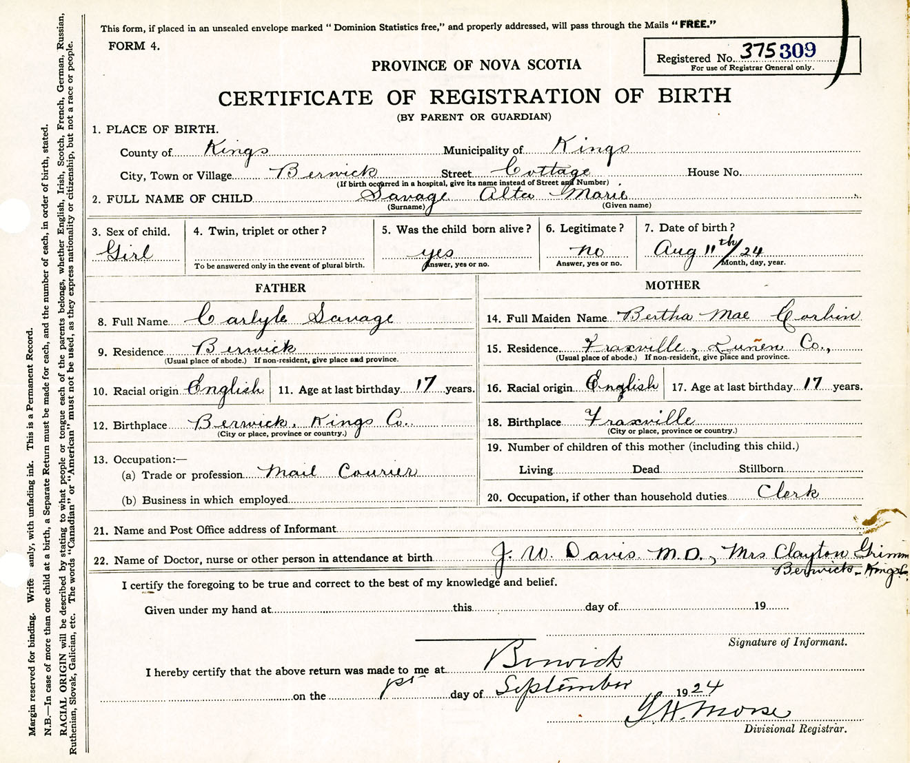 Female Birth Registration: Year: 1924 number: 37500309