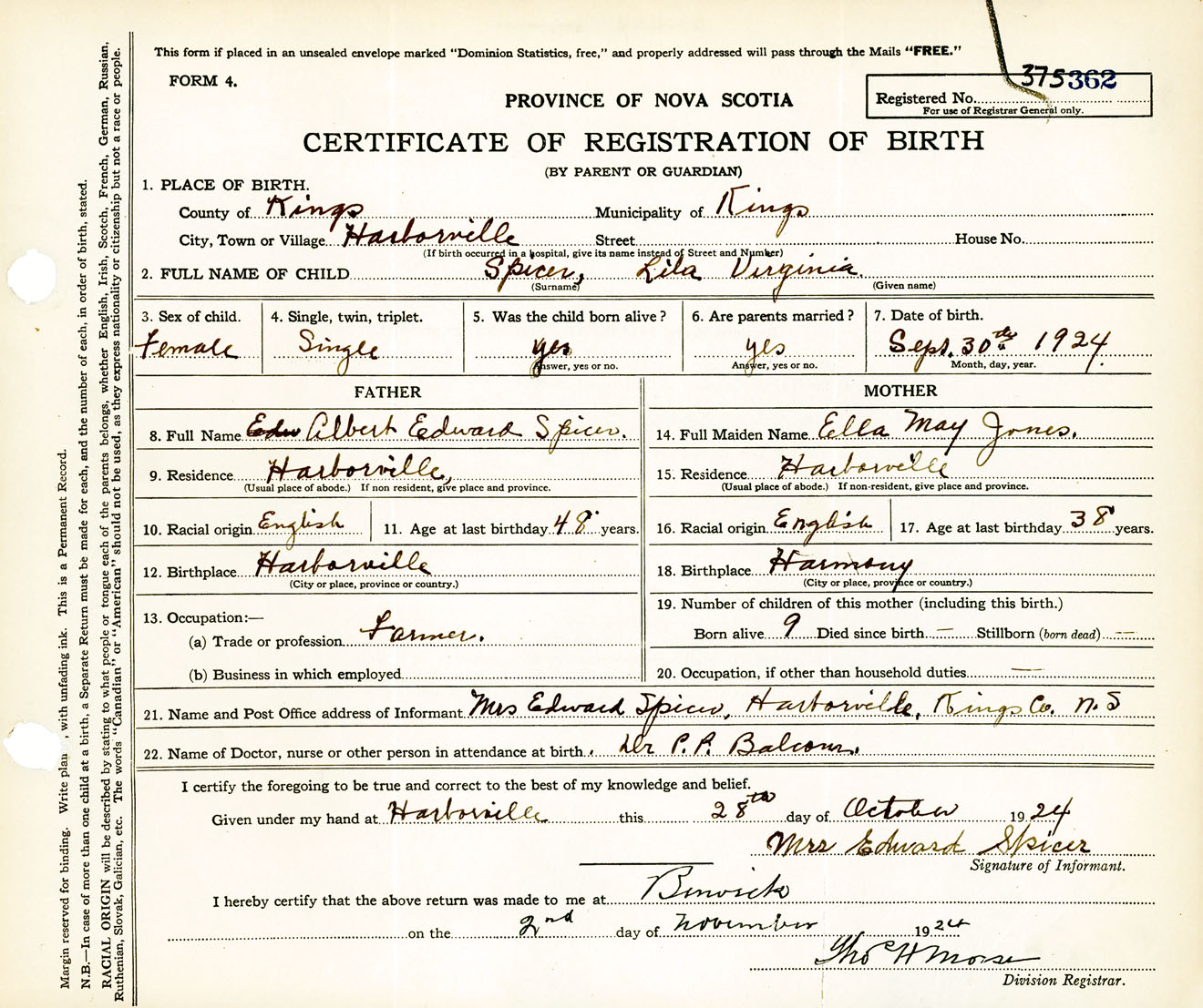Female Birth Registration: Year: 1924 number: 37500362