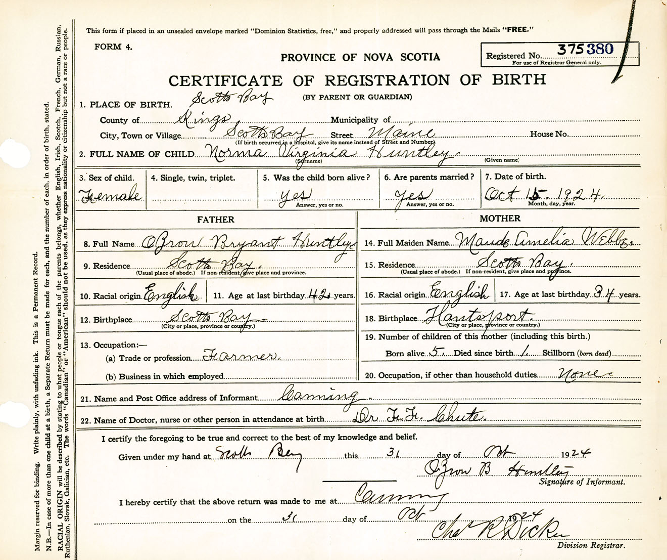 Female Birth Registration: Year: 1924 number: 37500380