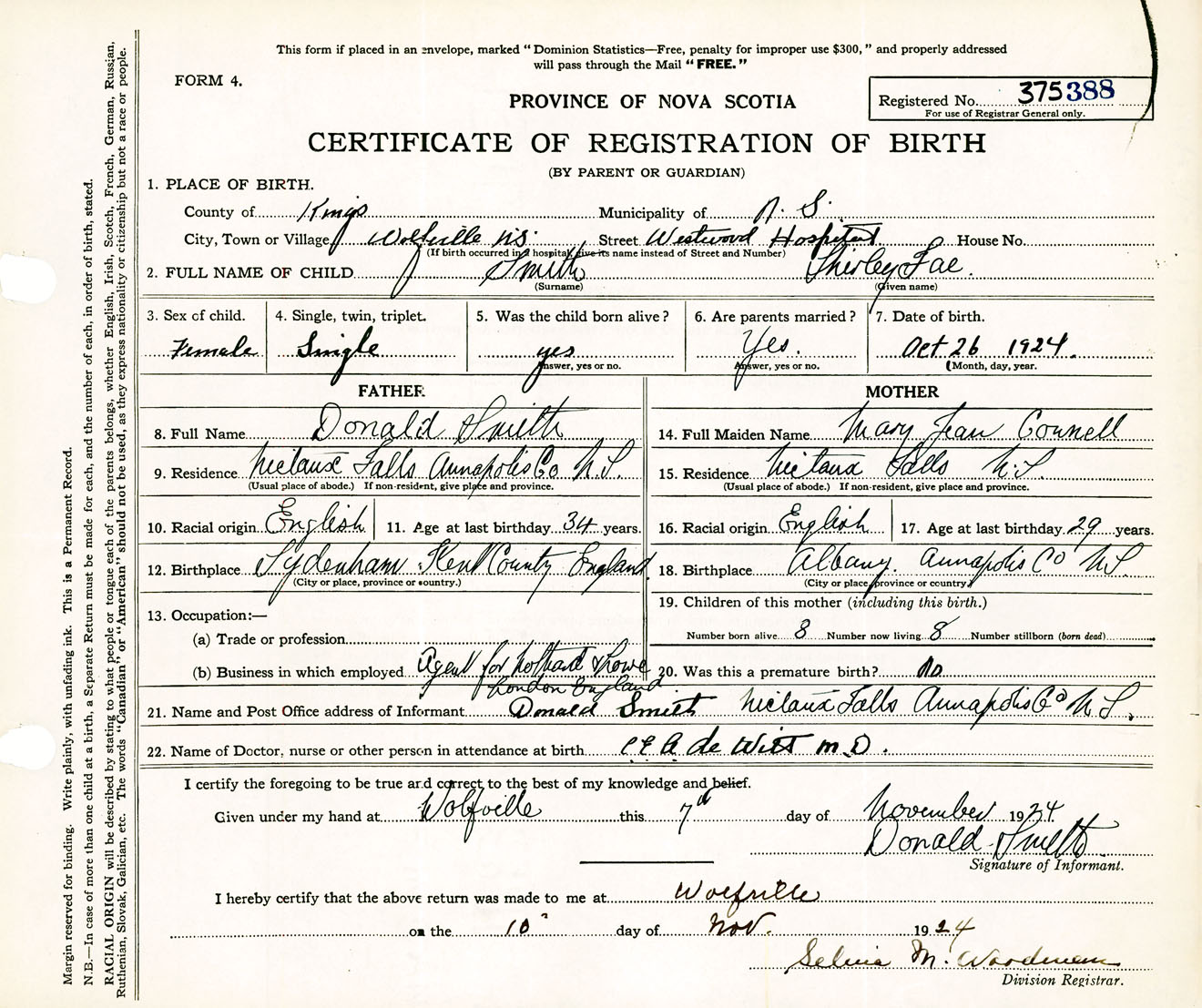 Female Birth Registration: Year: 1924 number: 37500388