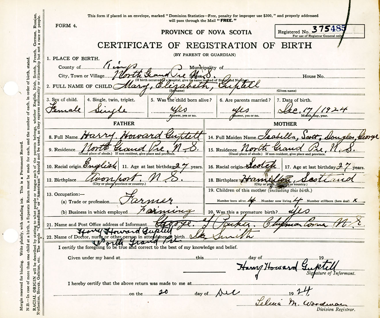Female Birth Registration: Year: 1924 number: 37500485