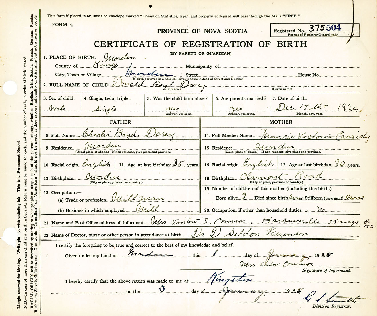 Male Birth Registration: Year: 1924 number: 37500504