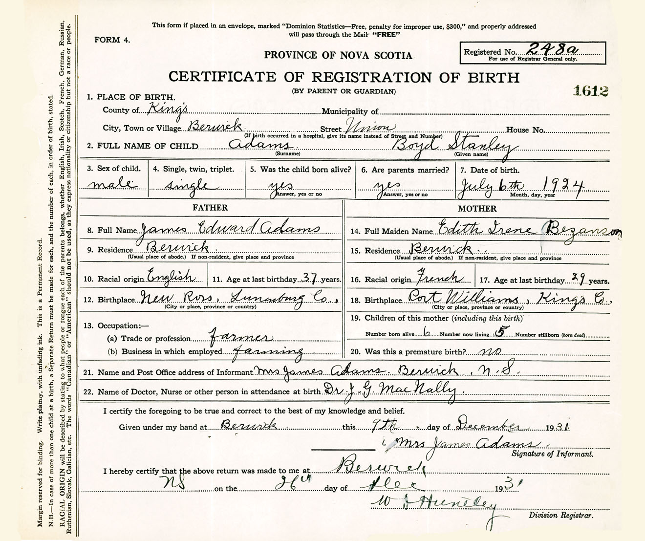 Nova Scotia Archives — https://archives.novascotia.ca/vital-statistics/birth/?ID=448570