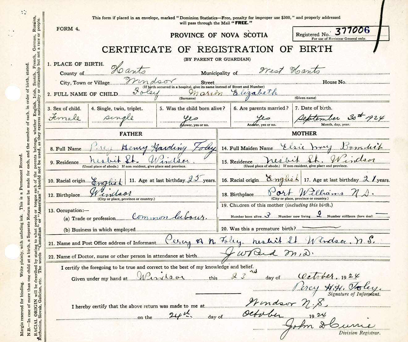 Female Birth Registration: Year: 1924 number: 37700006