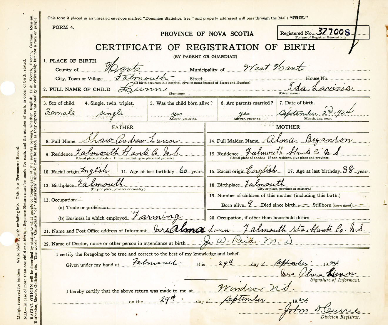 Female Birth Registration: Year: 1924 number: 37700008