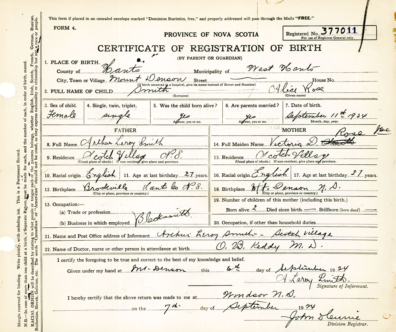 Female Birth Registration: Year: 1924 number: 37700011