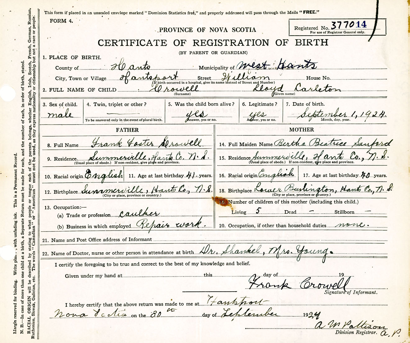 Male Birth Registration: Year: 1924 number: 37700014