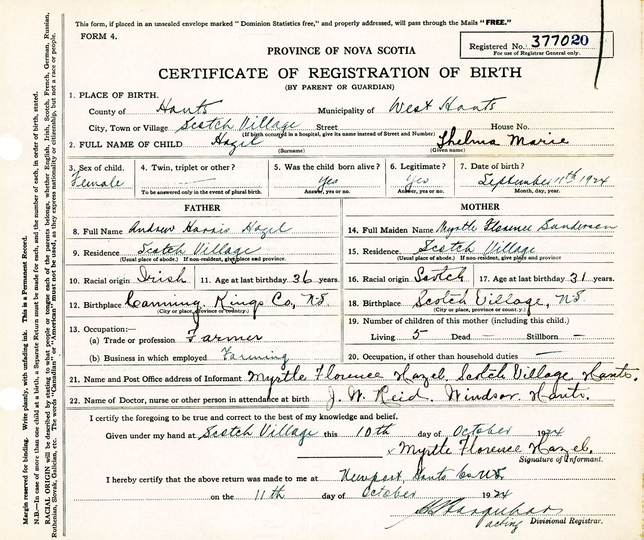 Female Birth Registration: Year: 1924 number: 37700020