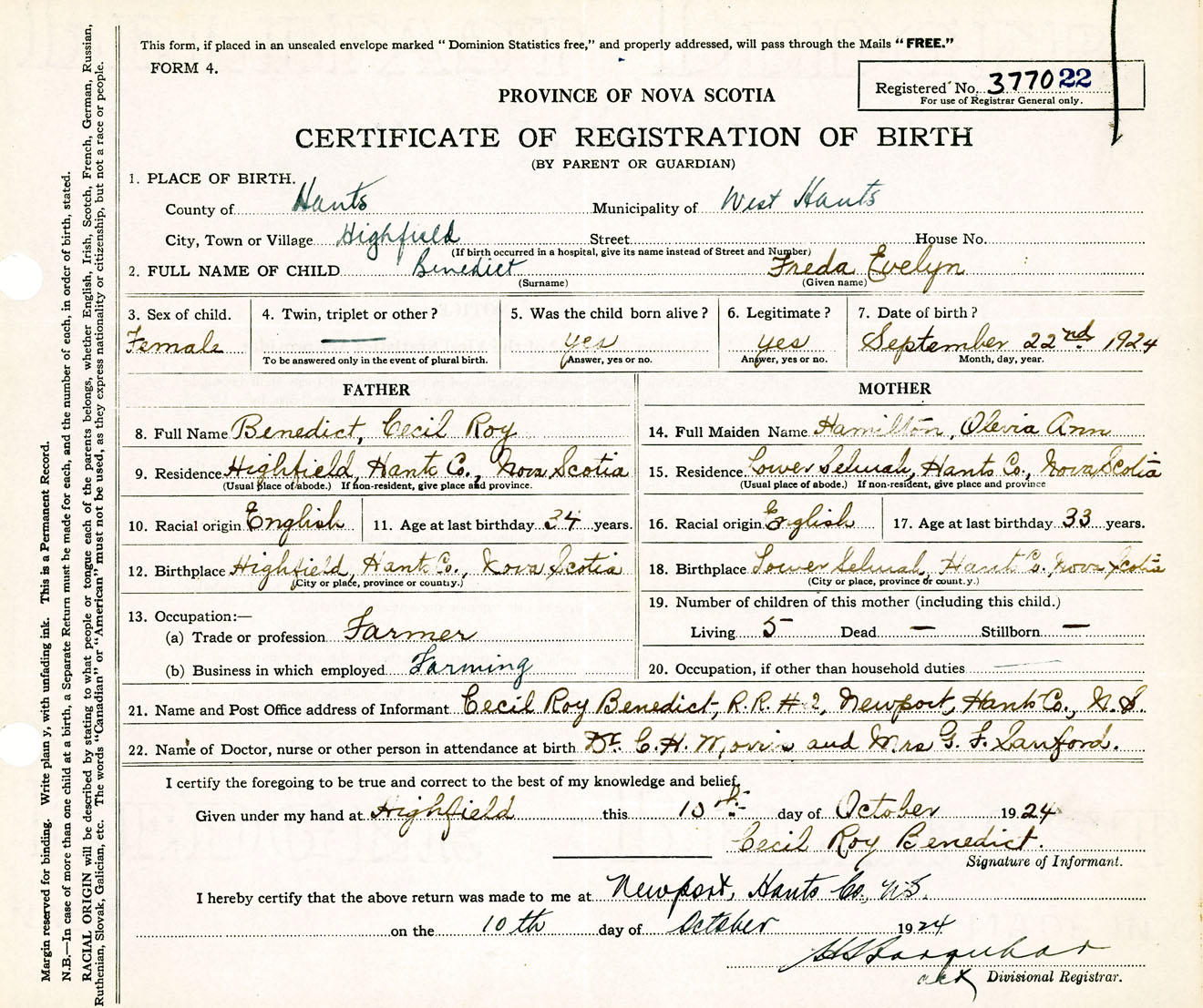 Female Birth Registration: Year: 1924 number: 37700022