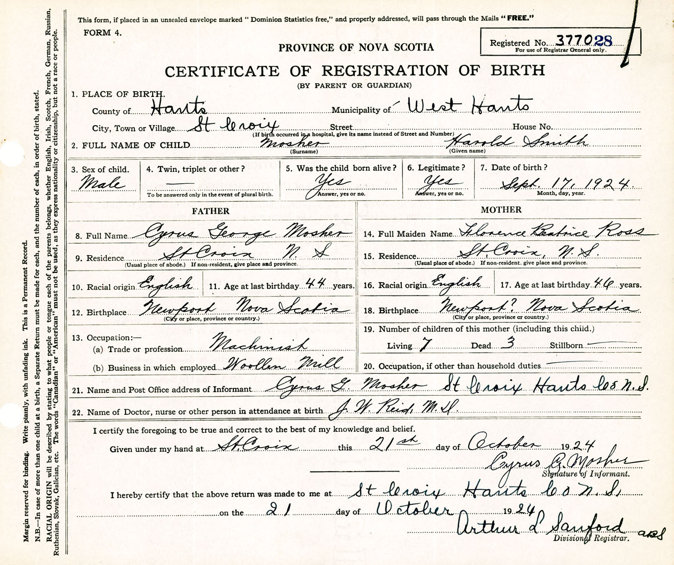 Male Birth Registration: Year: 1924 number: 37700028