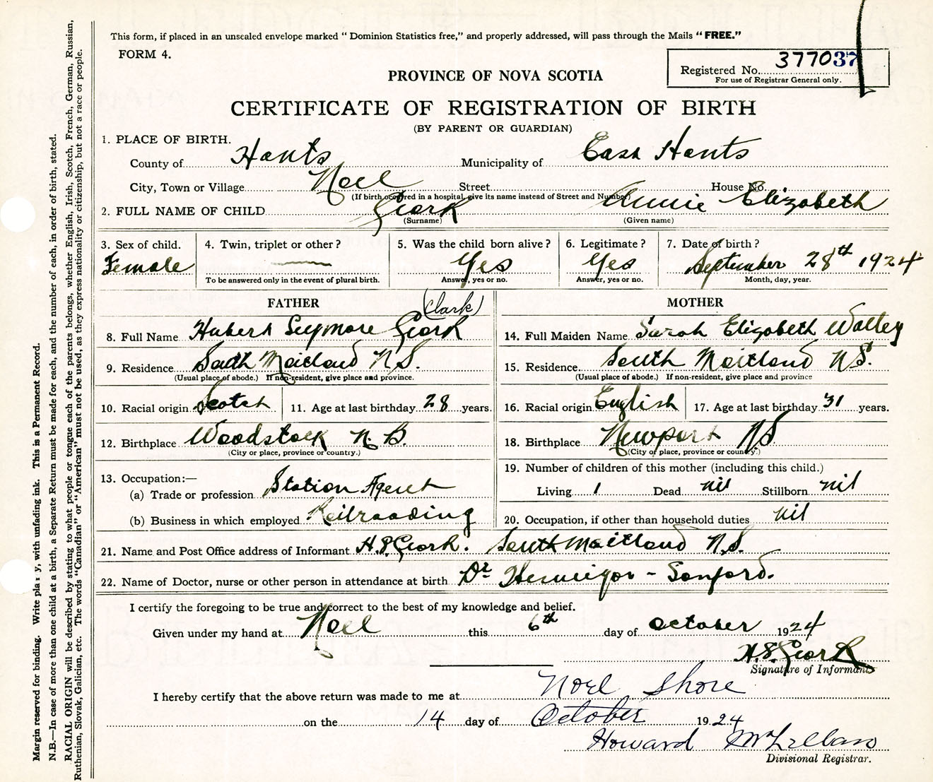 Female Birth Registration: Year: 1924 number: 37700037
