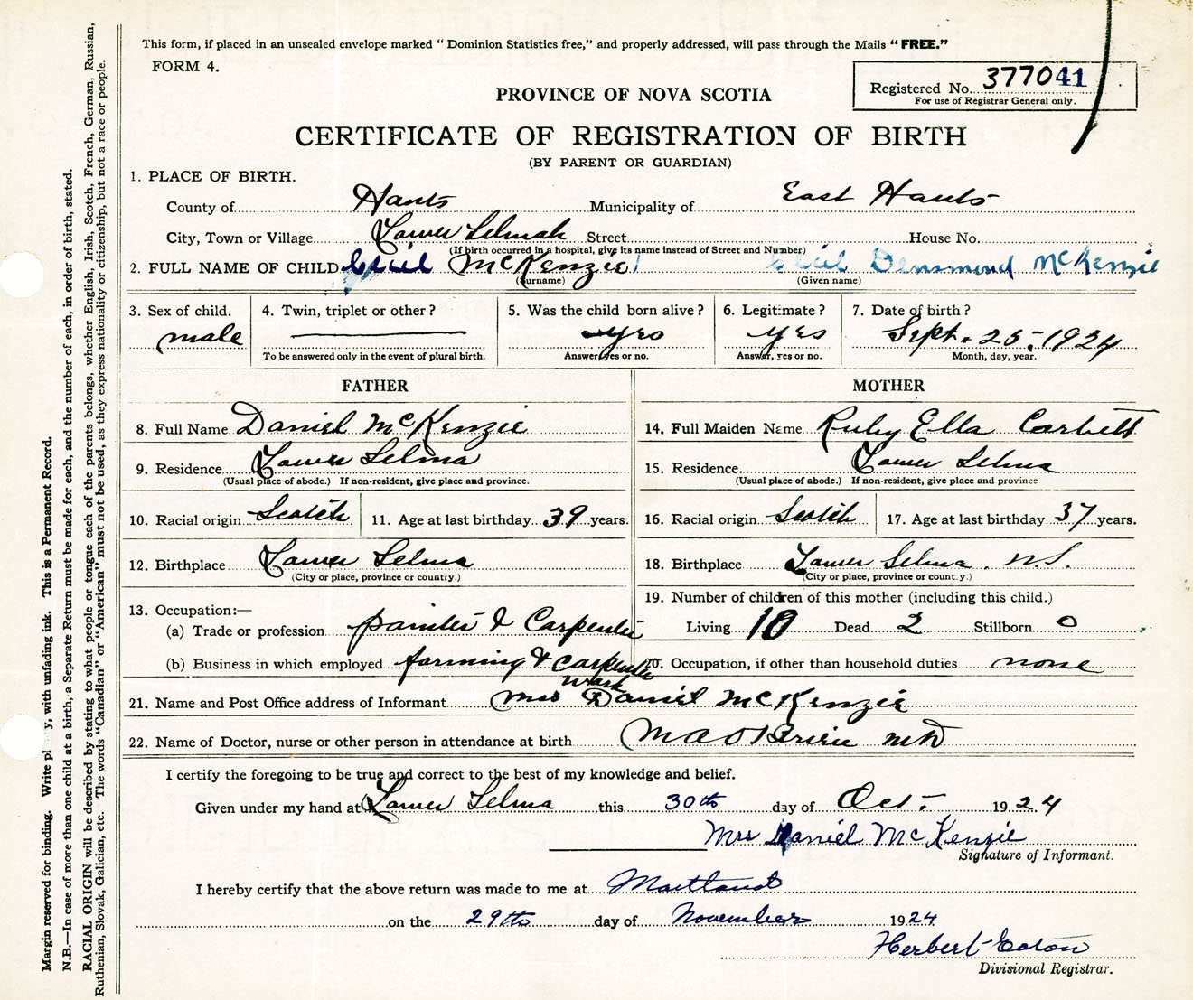 Male Birth Registration: Year: 1924 number: 37700041