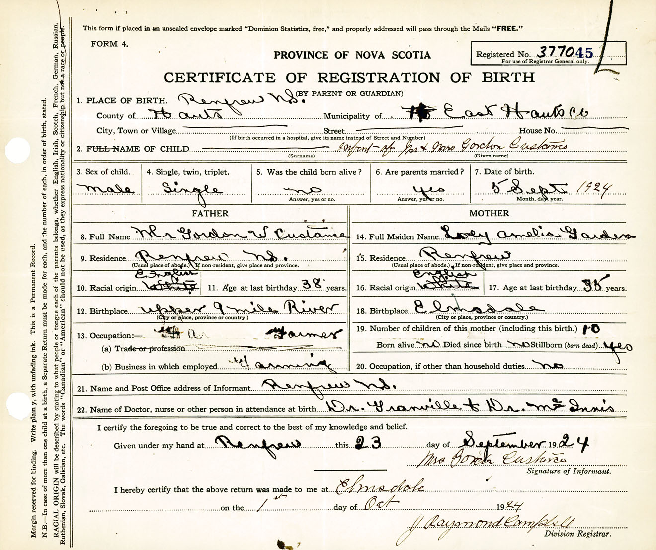 Male Birth Registration: Year: 1924 number: 37700045