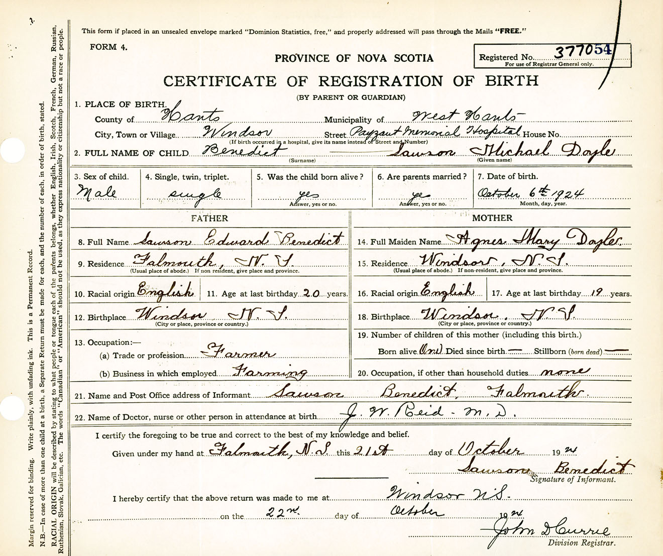Male Birth Registration: Year: 1924 number: 37700054