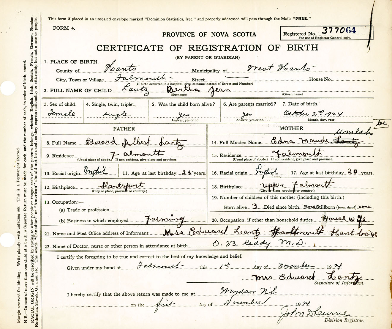 Female Birth Registration: Year: 1924 number: 37700064