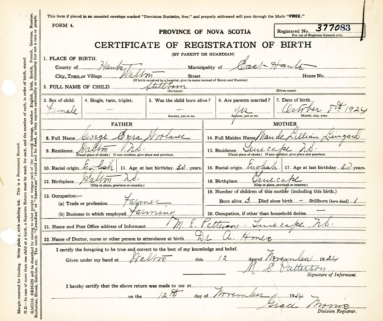 Female Birth Registration: Year: 1924 number: 37700083