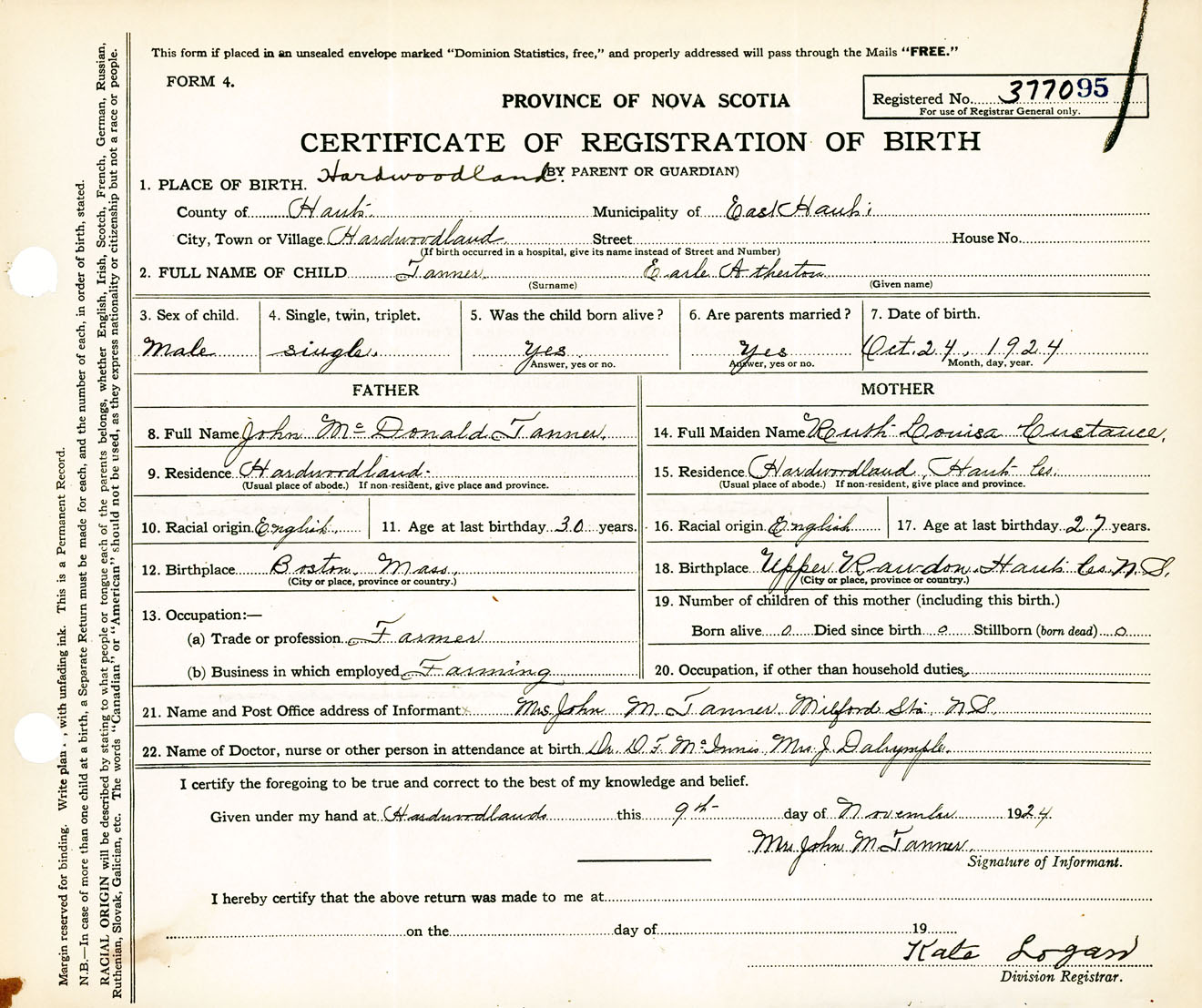 Male Birth Registration: Year: 1924 number: 37700095