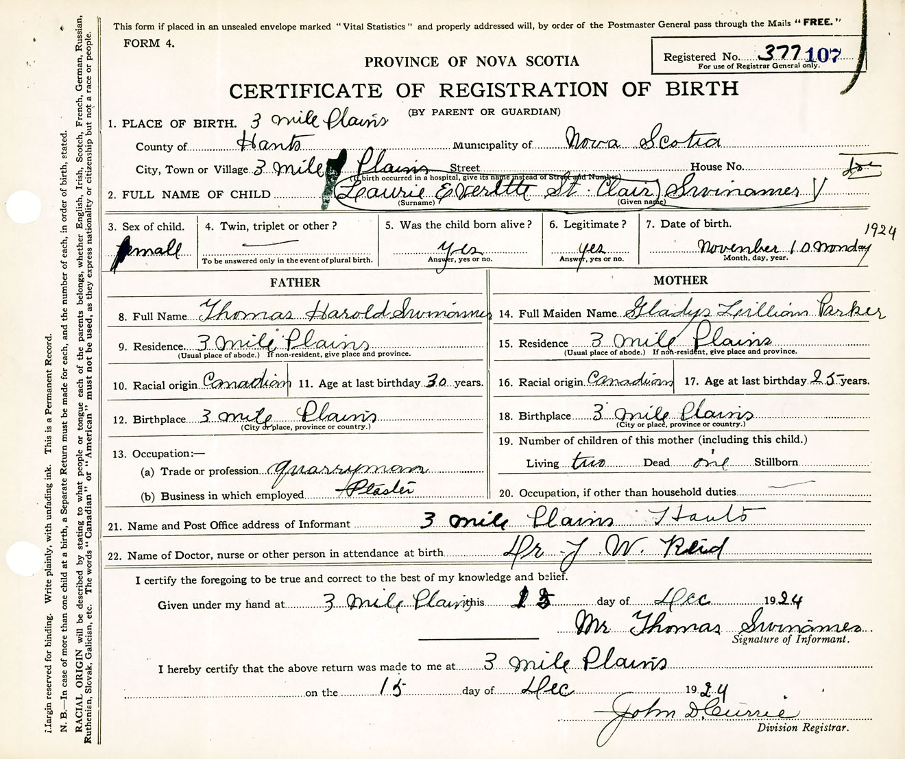Male Birth Registration: Year: 1924 number: 37700107