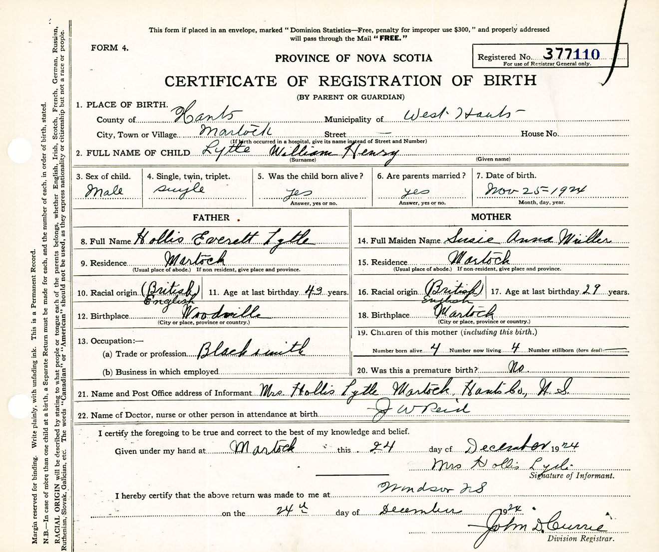 Male Birth Registration: Year: 1924 number: 37700110