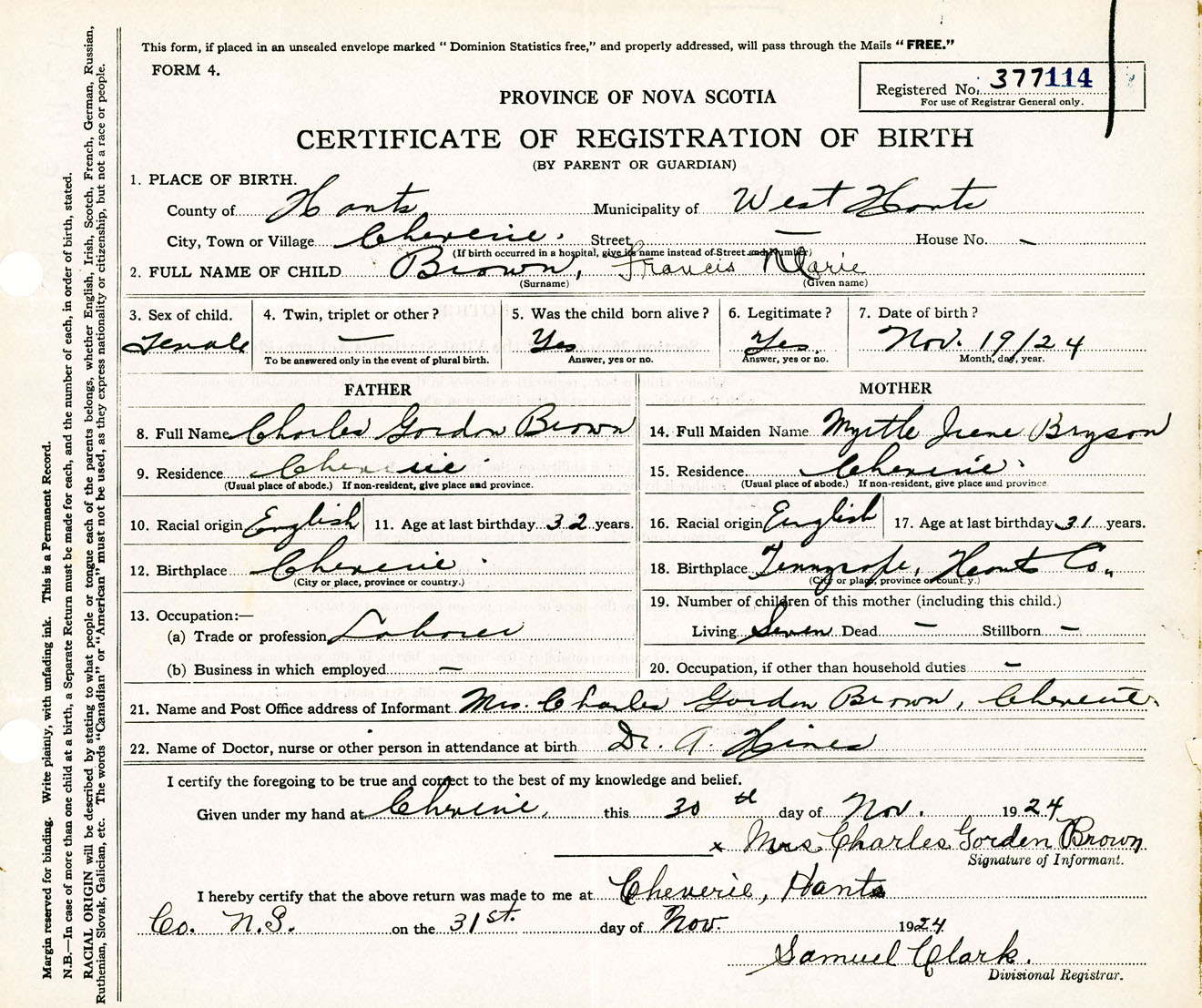 Female Birth Registration: Year: 1924 number: 37700114