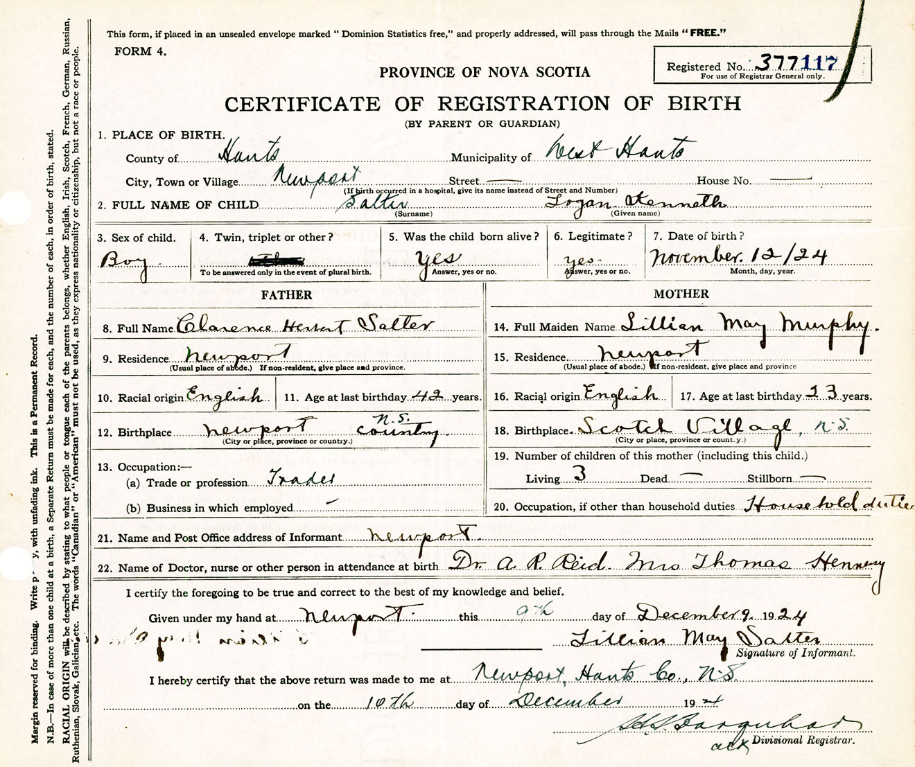 Male Birth Registration: Year: 1924 number: 37700117
