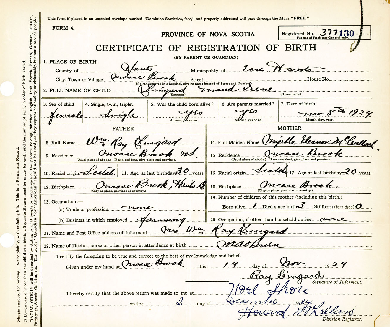 Female Birth Registration: Year: 1924 number: 37700130