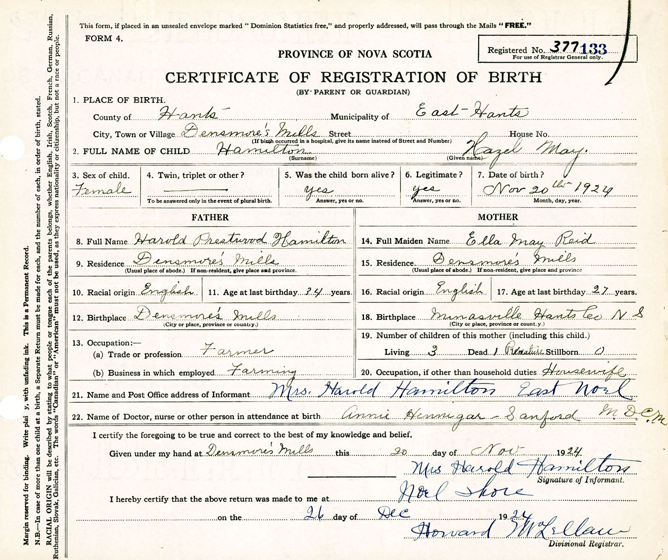 Female Birth Registration: Year: 1924 number: 37700133