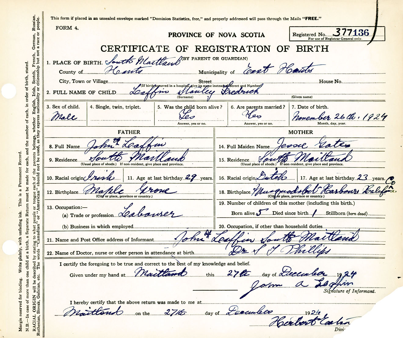 Male Birth Registration: Year: 1924 number: 37700136