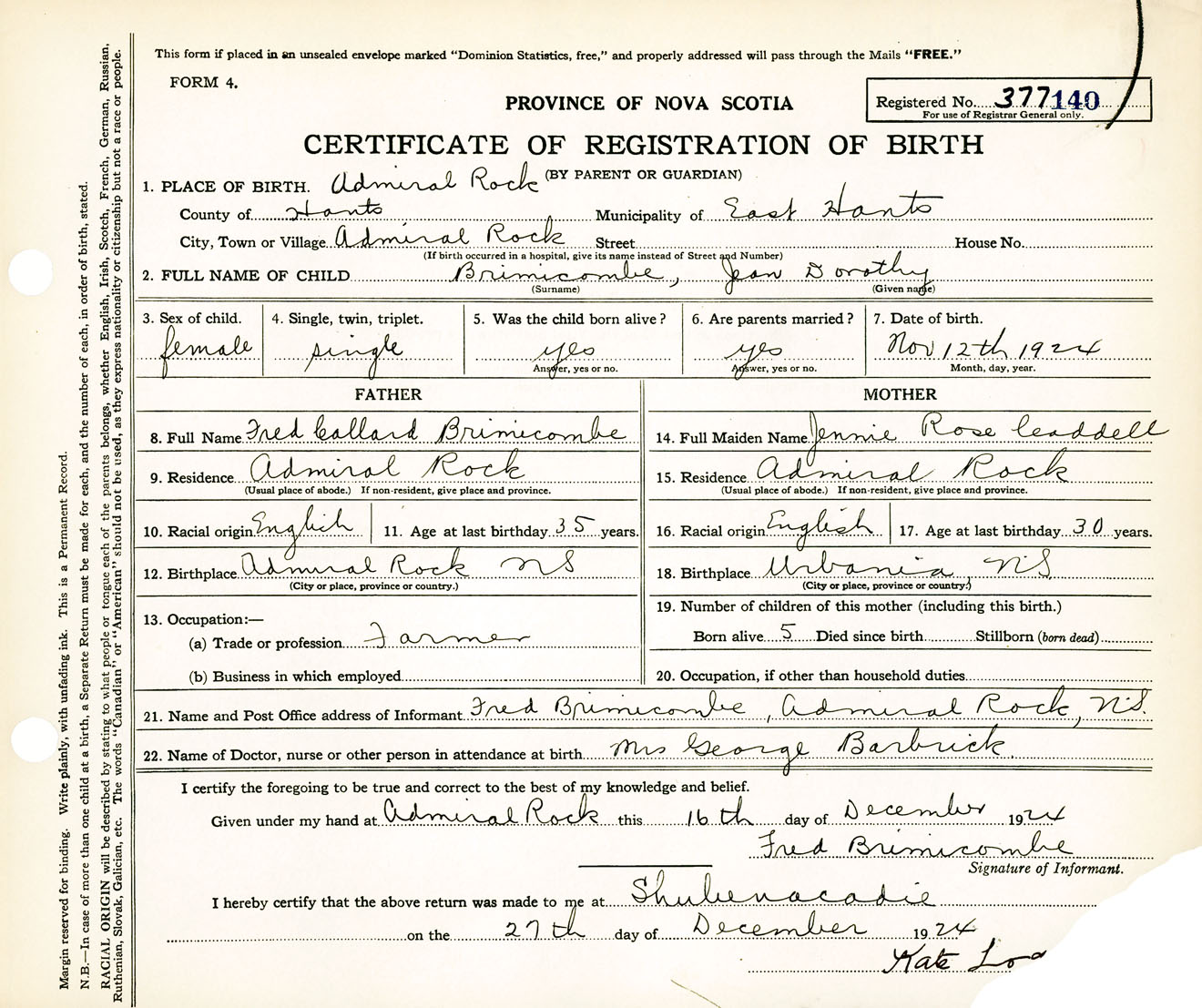 Female Birth Registration: Year: 1924 number: 37700140