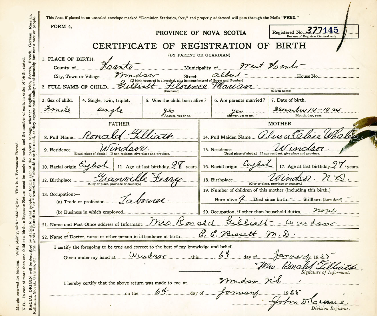 Female Birth Registration: Year: 1924 number: 37700145