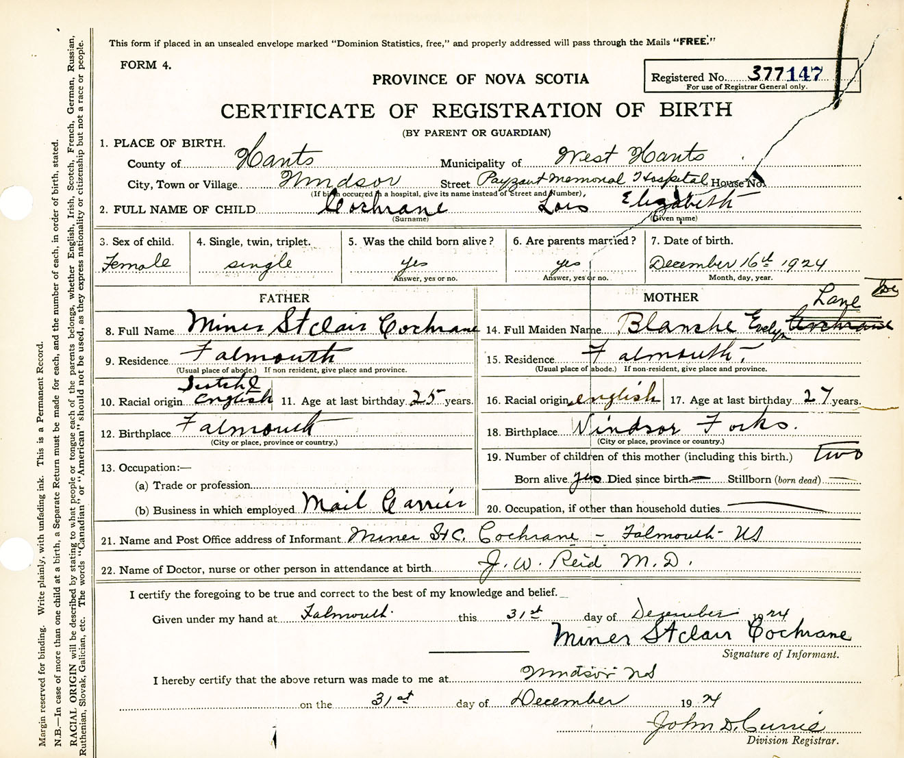 Female Birth Registration: Year: 1924 number: 37700147