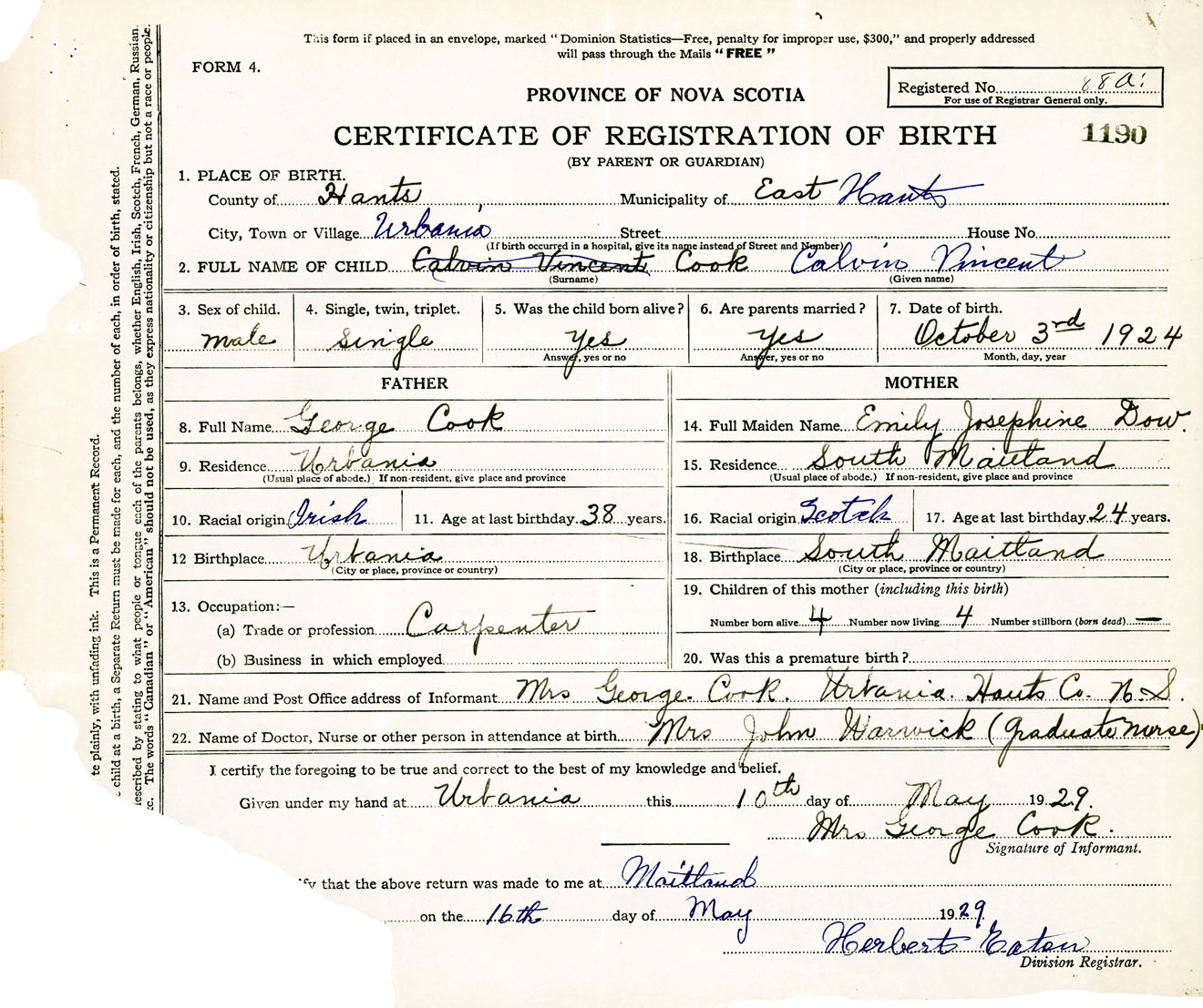 Male Birth Registration: Year: 1924 number: 37800190