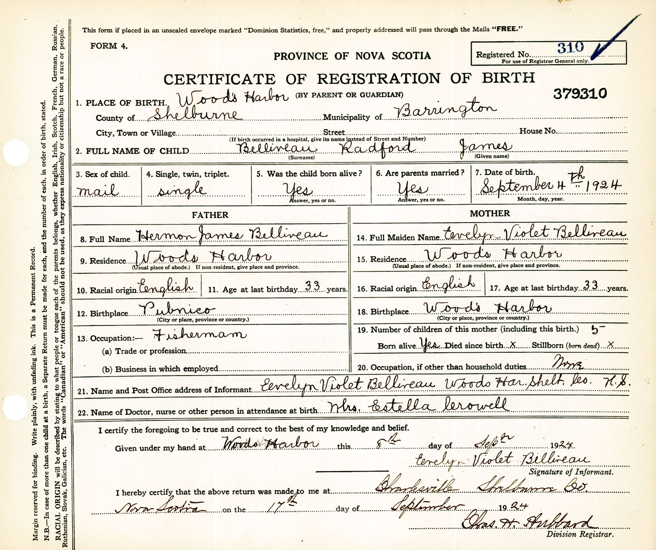 Male Birth Registration: Year: 1924 number: 37900310