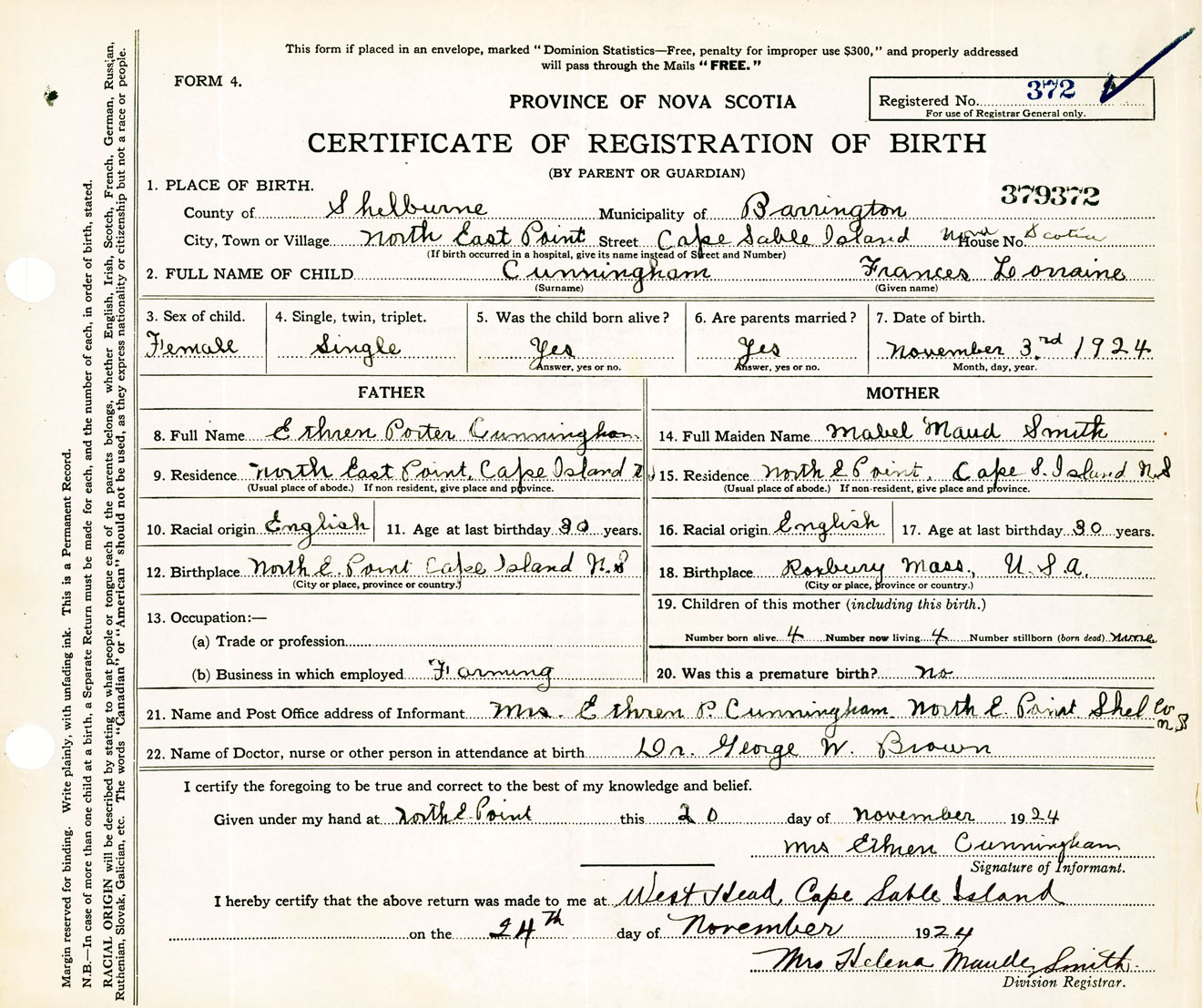 Female Birth Registration: Year: 1924 number: 37900372