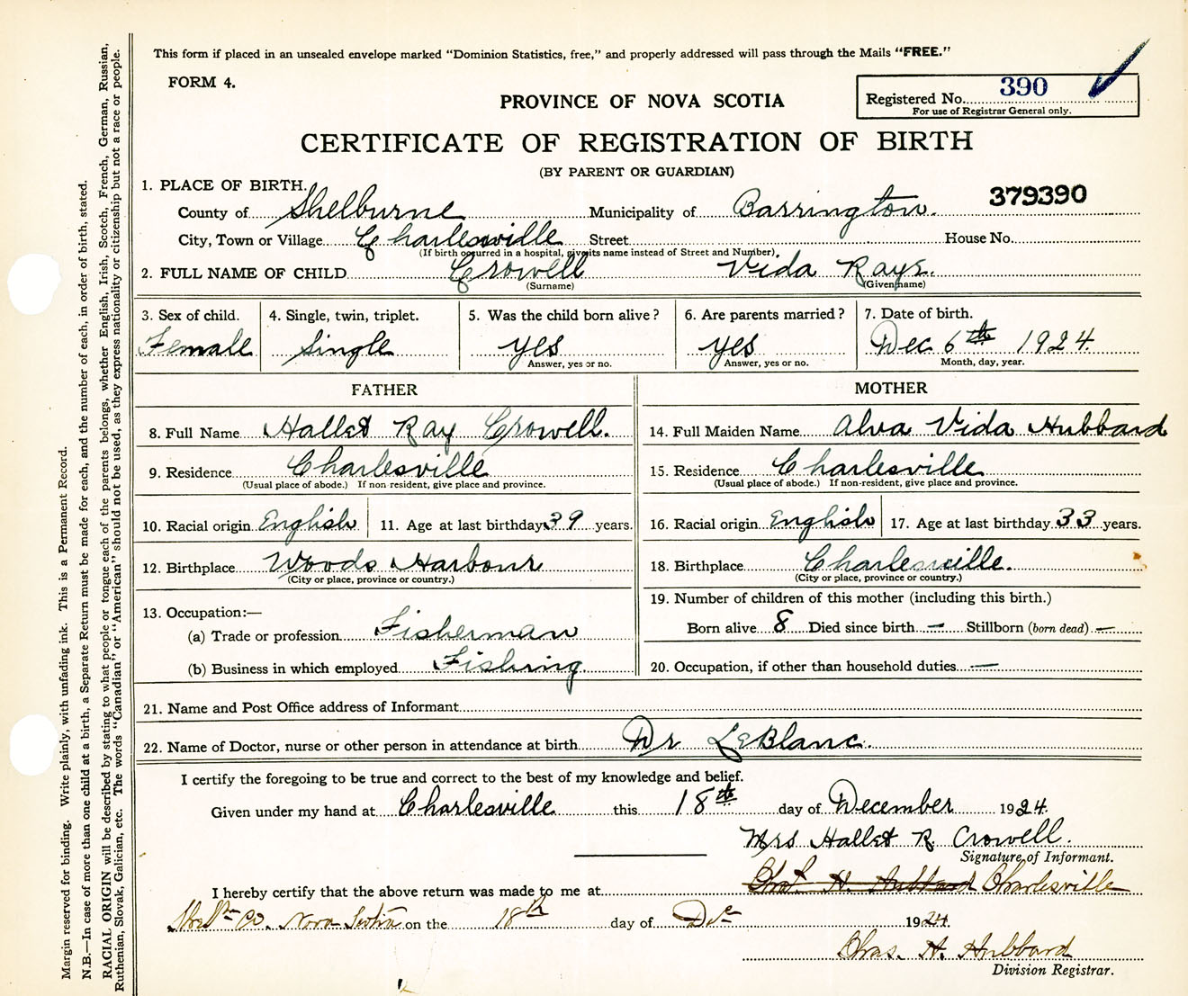 Female Birth Registration: Year: 1924 number: 37900390