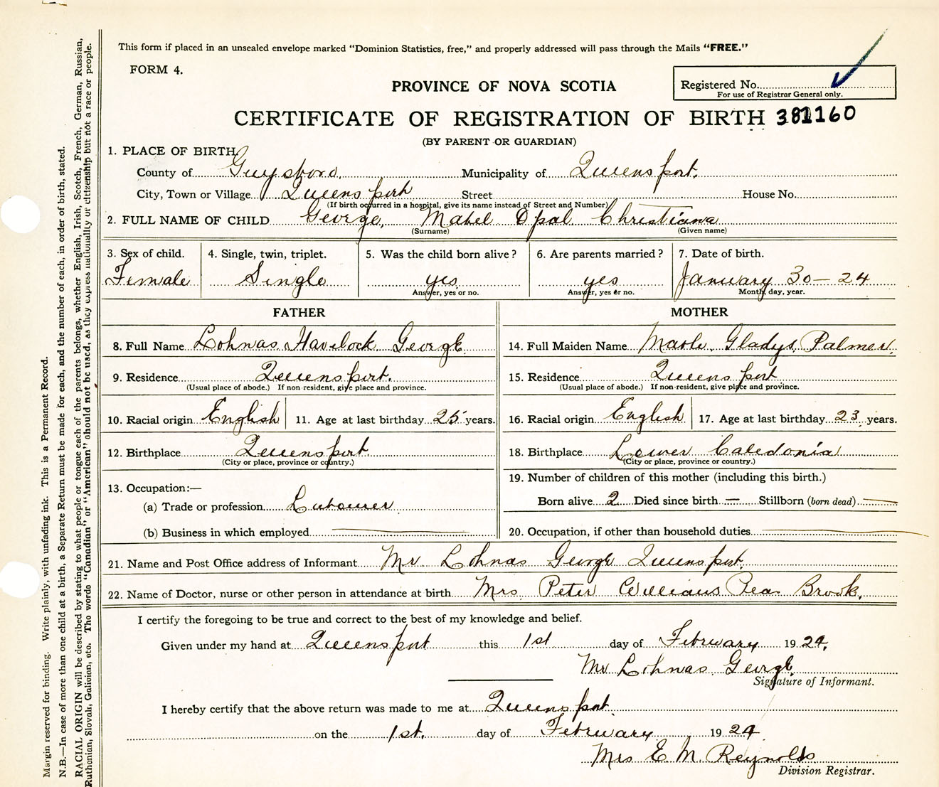 Female Birth Registration: Year: 1924 number: 38100160