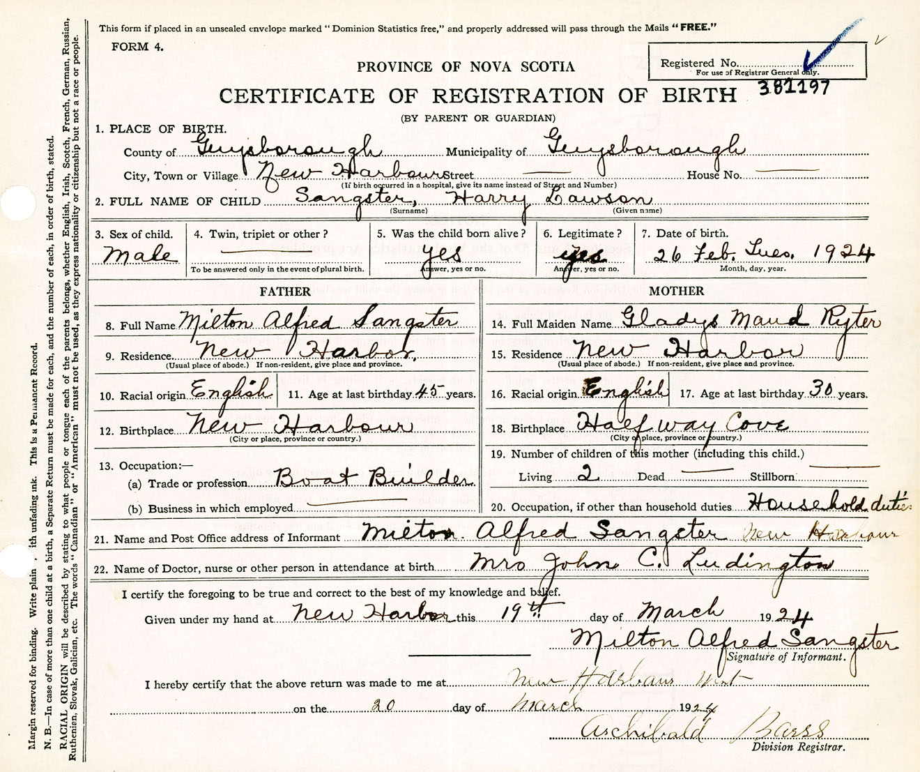 Male Birth Registration: Year: 1924 number: 38100197