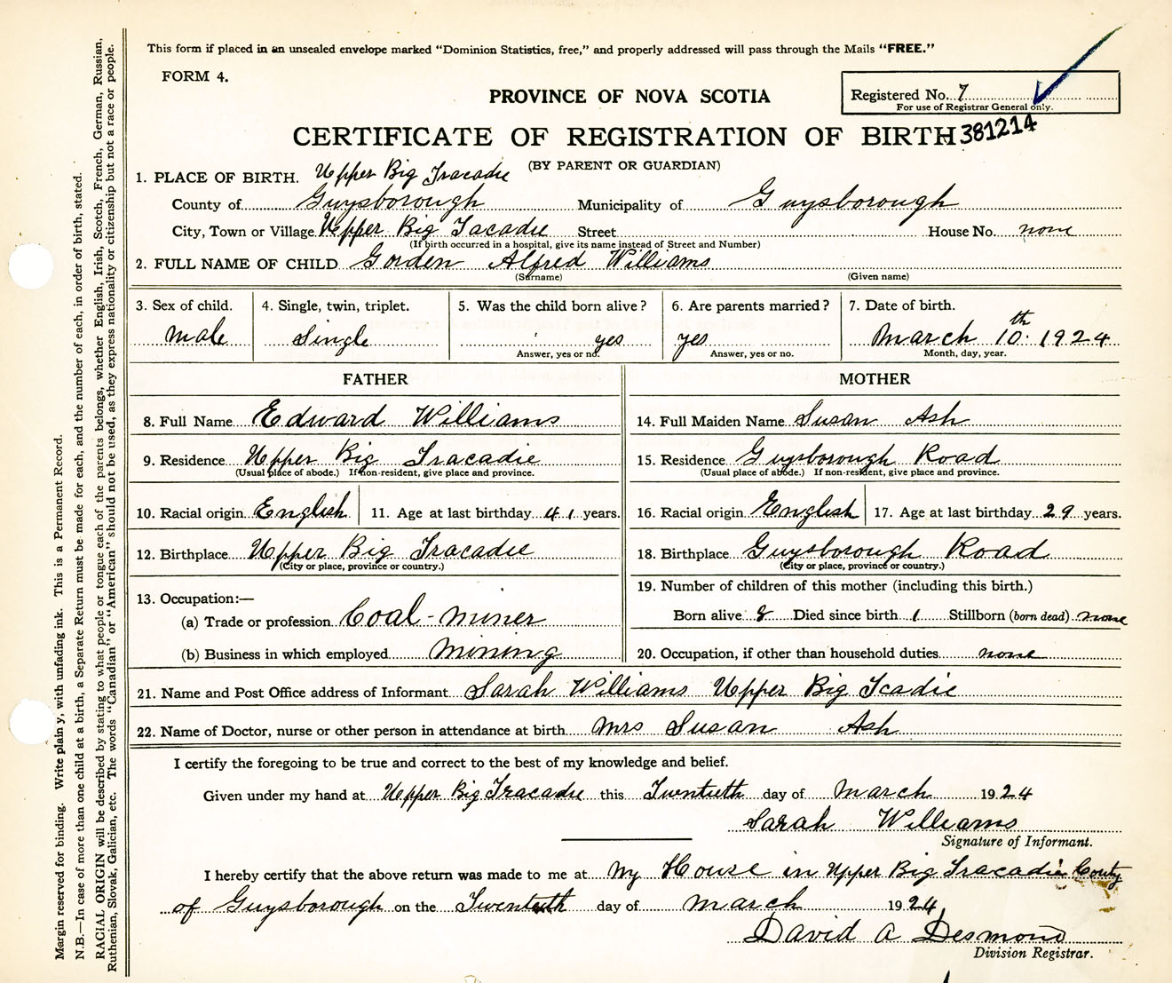 Male Birth Registration: Year: 1924 number: 38100214
