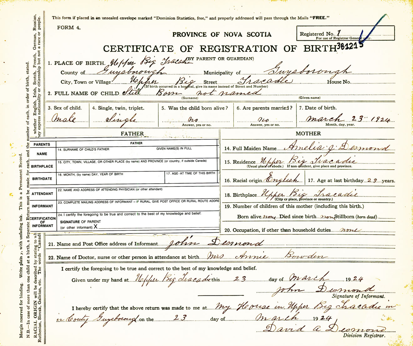 Male Birth Registration: Year: 1924 number: 38100215