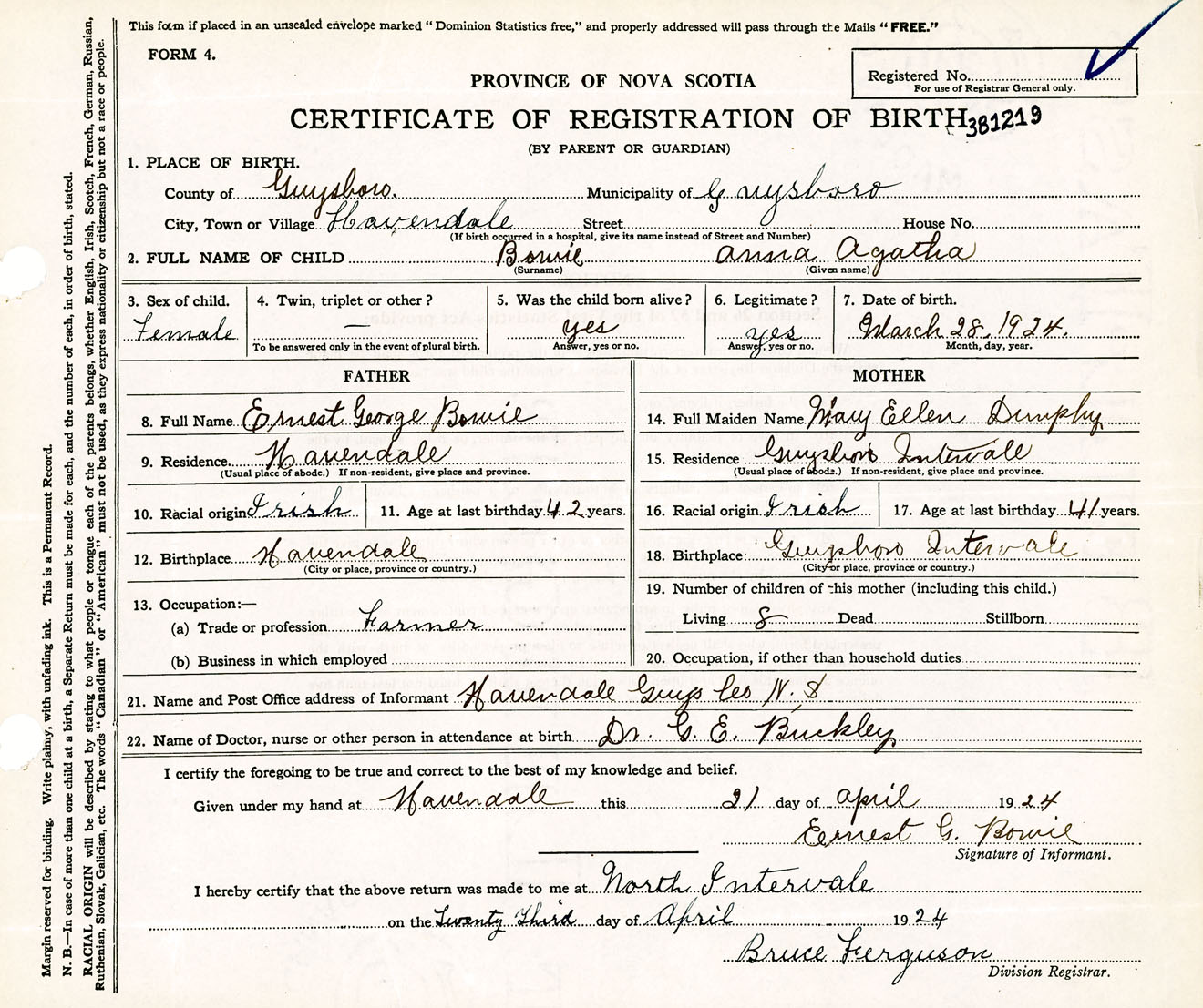 Female Birth Registration: Year: 1924 number: 38100219