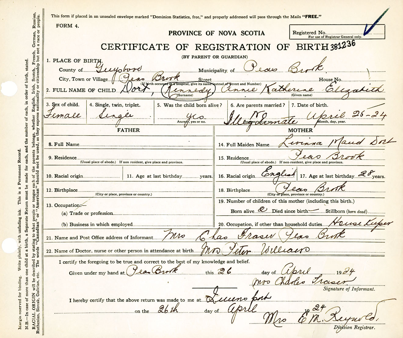 Female Birth Registration: Year: 1924 number: 38100236