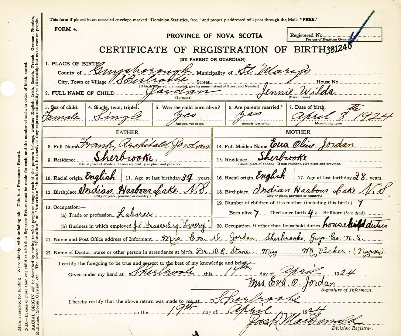 Female Birth Registration: Year: 1924 number: 38100240