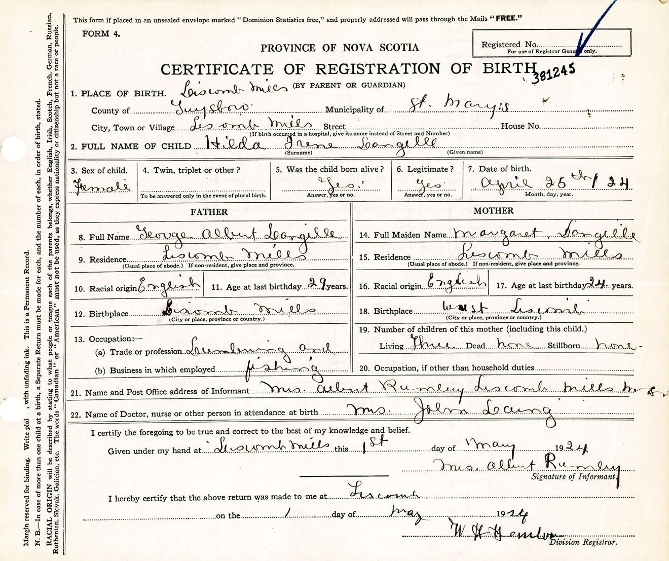 Female Birth Registration: Year: 1924 number: 38100245