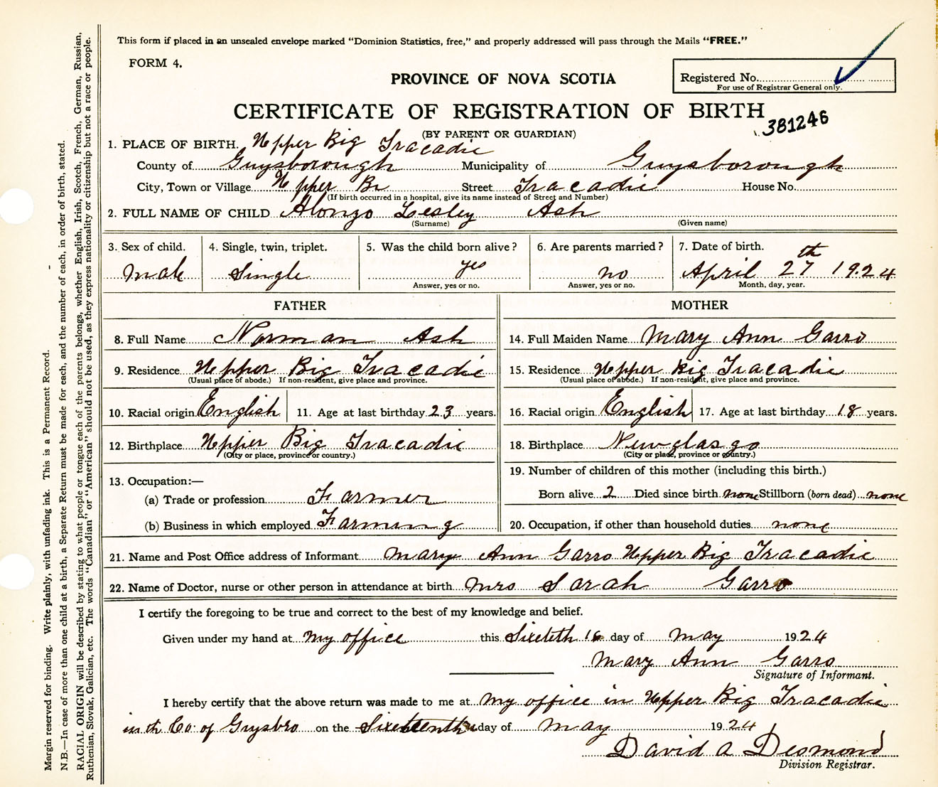 Male Birth Registration: Year: 1924 number: 38100246