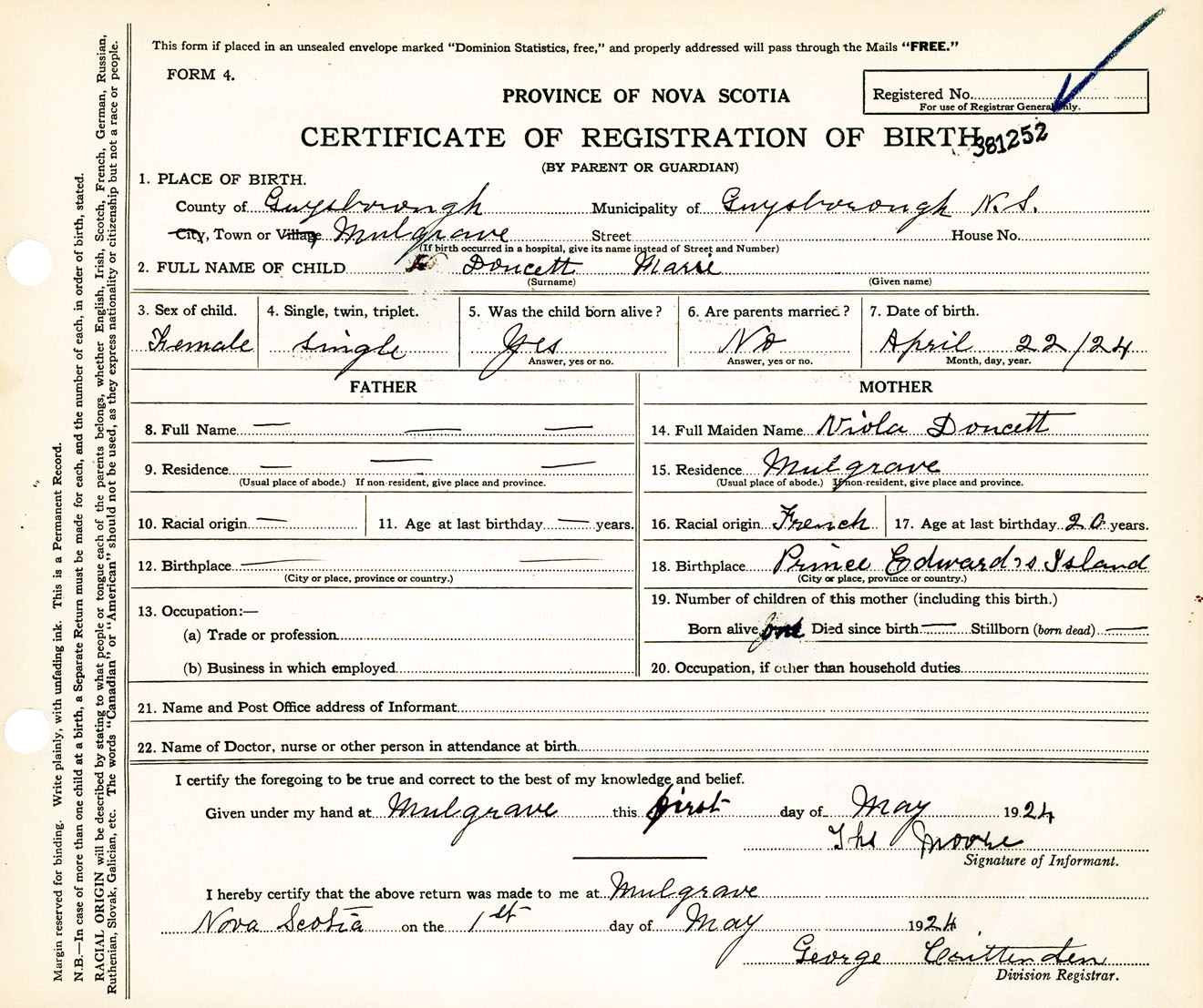 Female Birth Registration: Year: 1924 number: 38100252
