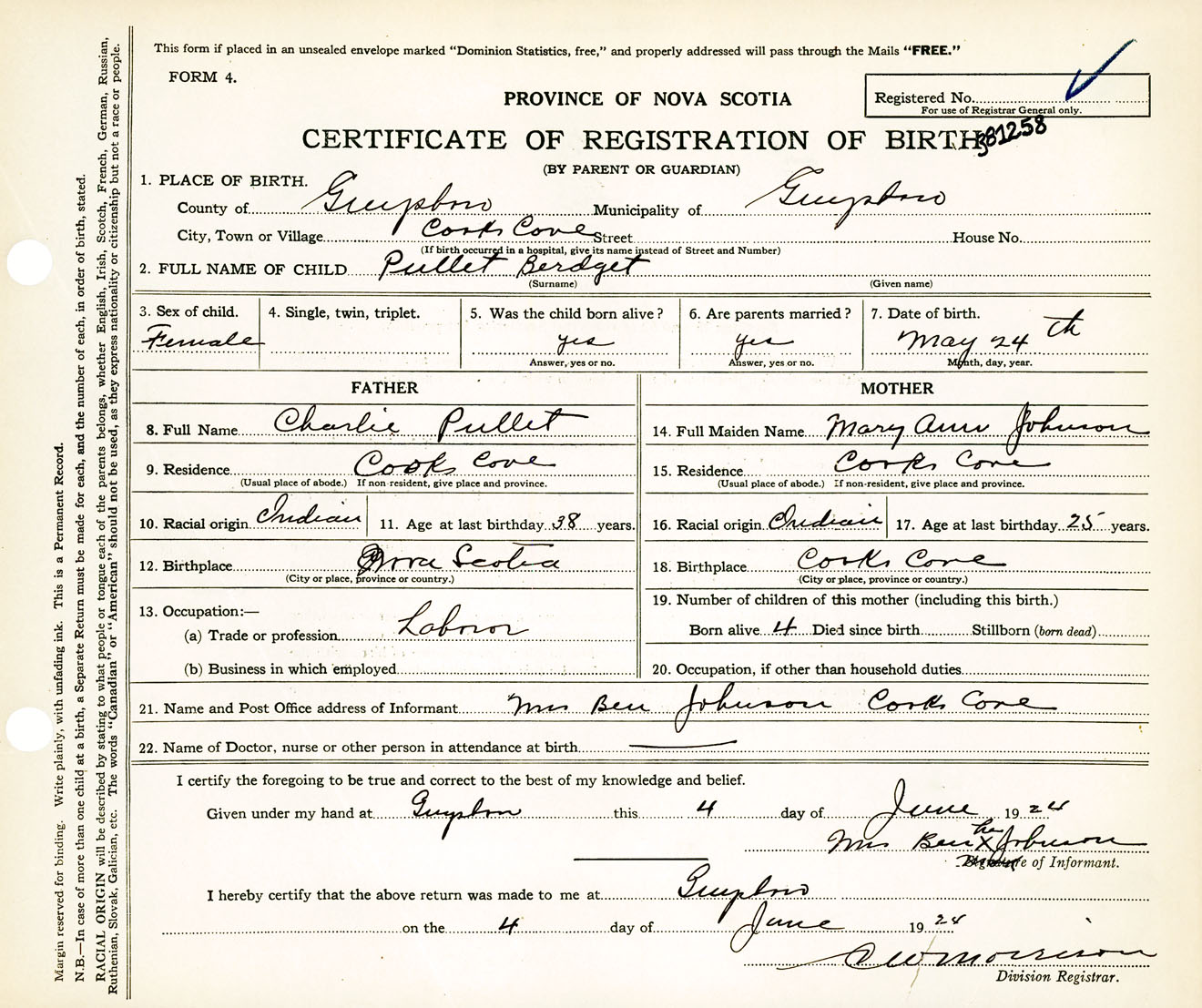 Female Birth Registration: Year: 1924 number: 38100258