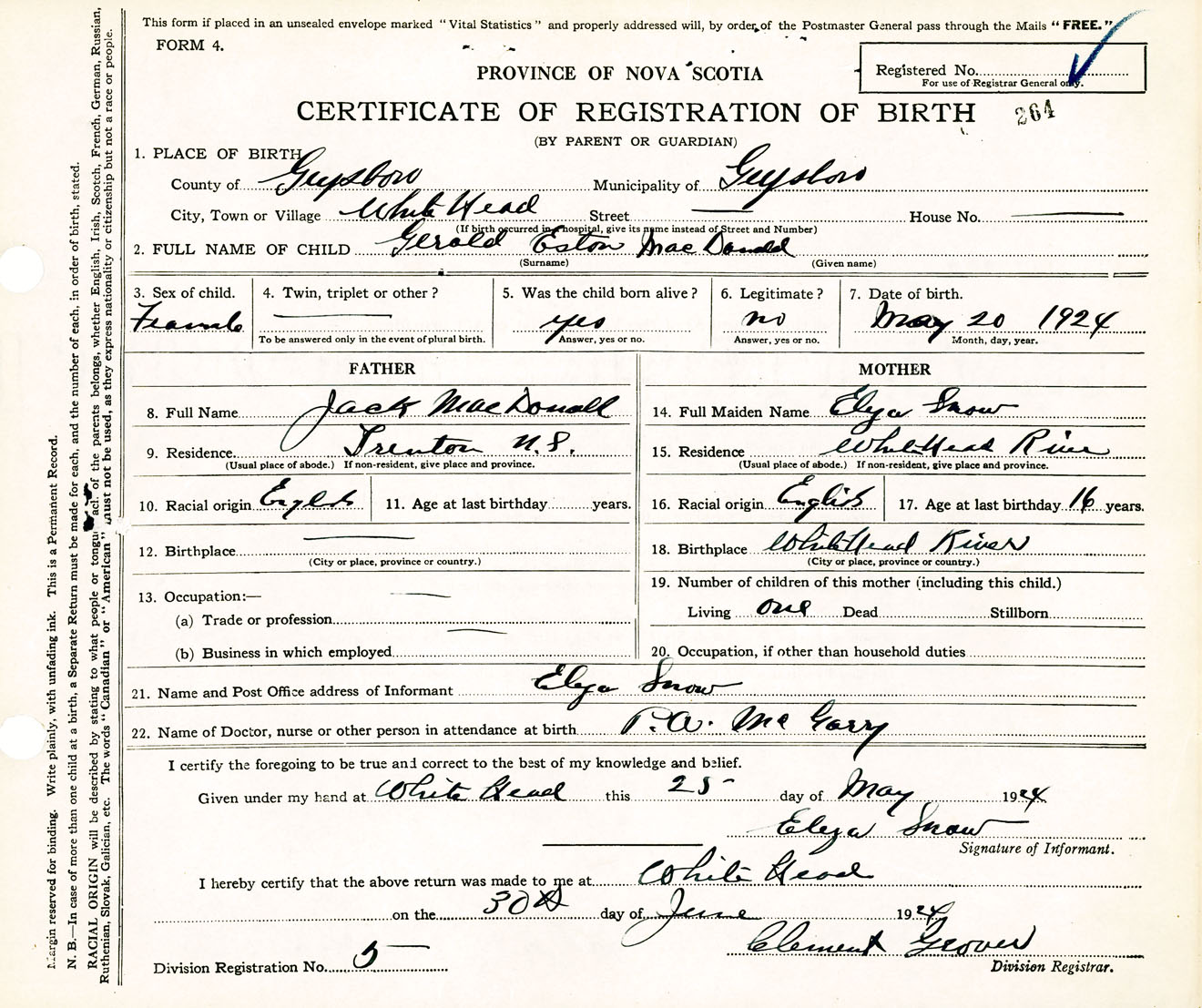 Female Birth Registration: Year: 1924 number: 38100264