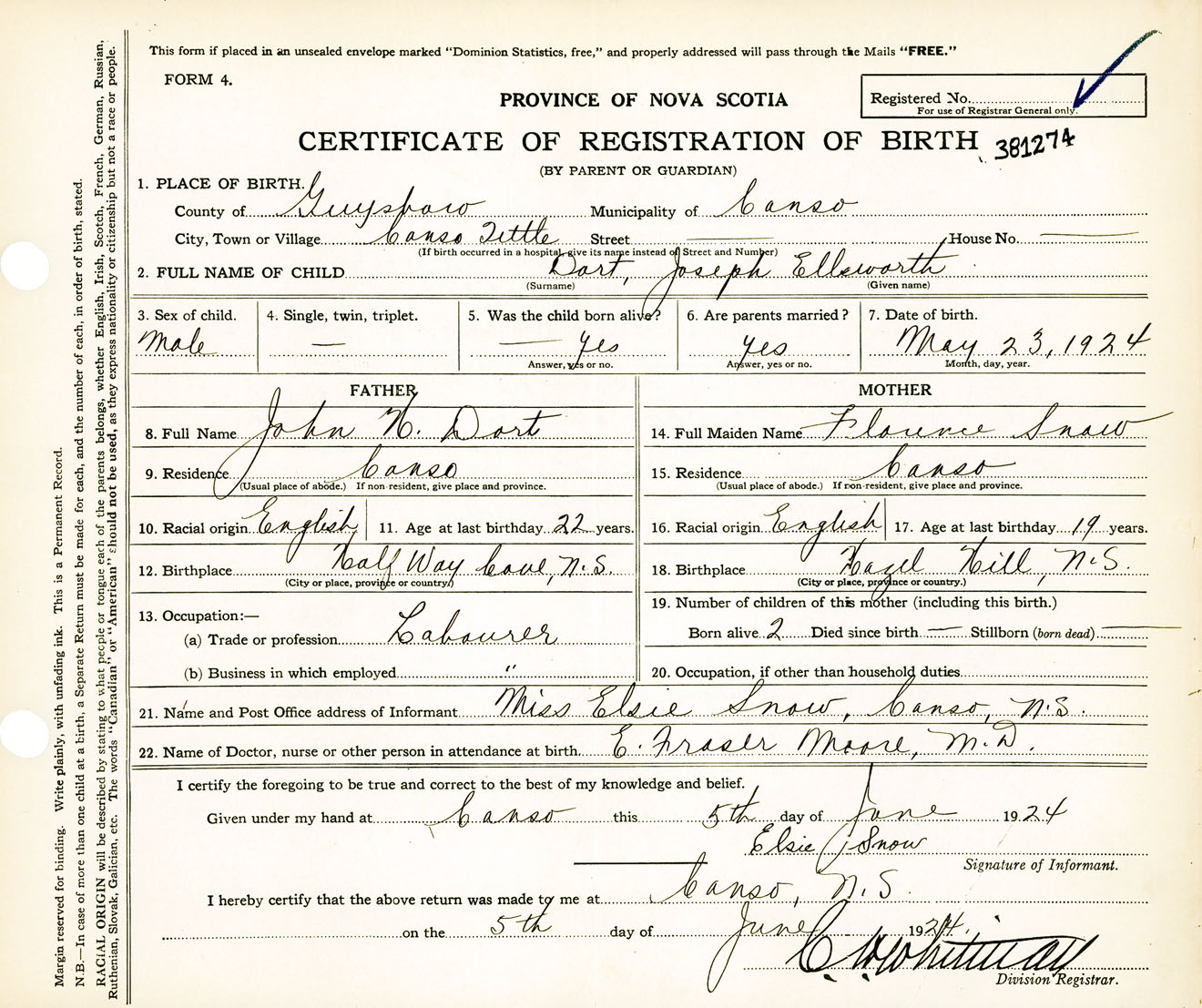 Male Birth Registration: Year: 1924 number: 38100274
