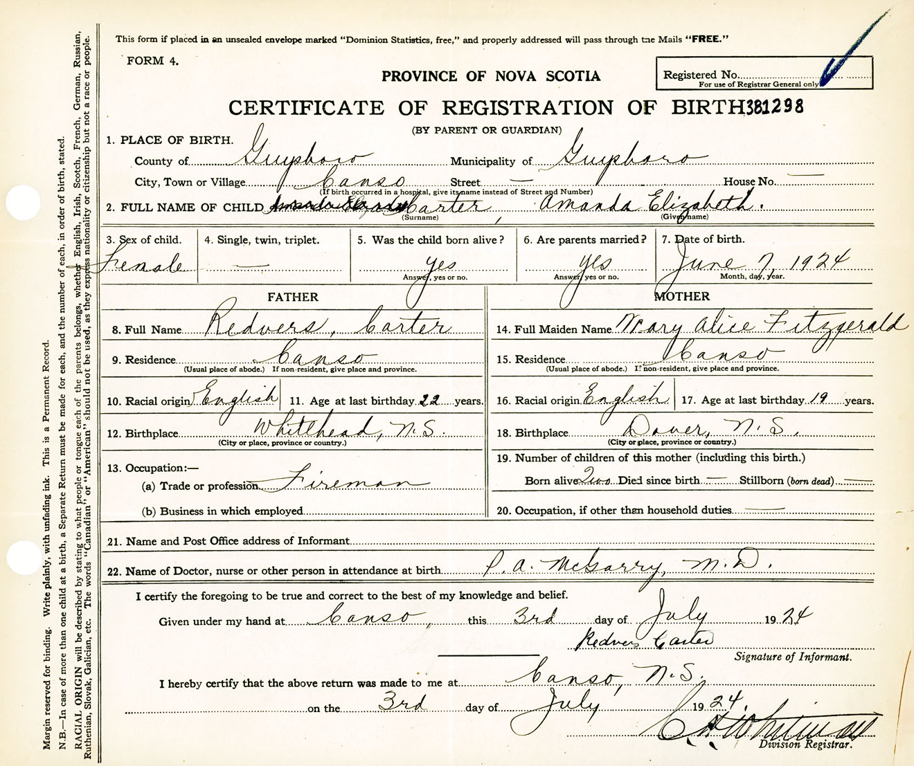 Female Birth Registration: Year: 1924 number: 38100298