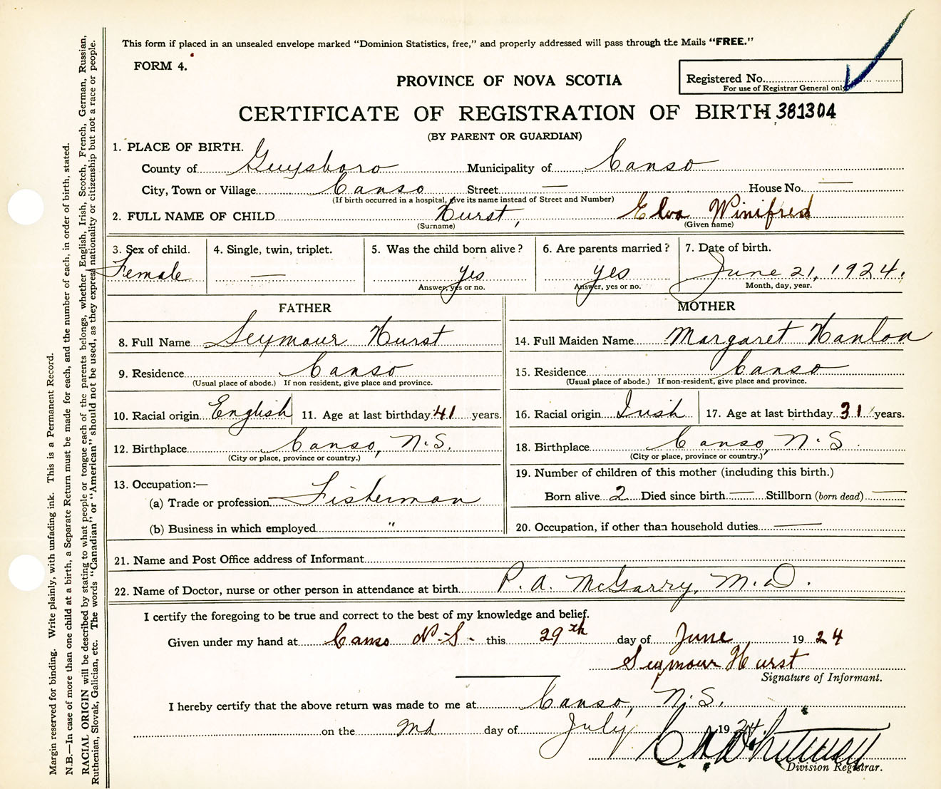 Female Birth Registration: Year: 1924 number: 38100304
